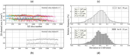 Evolution of the cross-section areas along the XZ direction of (a) channels 1 to 7, (b) channel 8. Deviation distribution obtained for the pressure drop specimen printed with parameter sets: (c) Set I, (d) Set II.