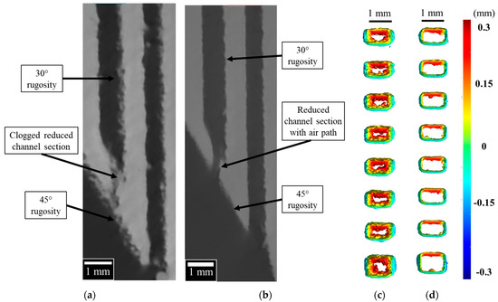 A 2D slice of the reduced section of the widest channel (n°8) printed with (a) Set I (t = 50 µm) and (b) Set II (t = 25 µm). The section is partially clogged using the parameter with the higher layer thickness. (c) A 3D view of one extremity of the deviation map computed for the height channels: (c) Set I (t = 50 µm), (d) Set II (t = 25 µm).
