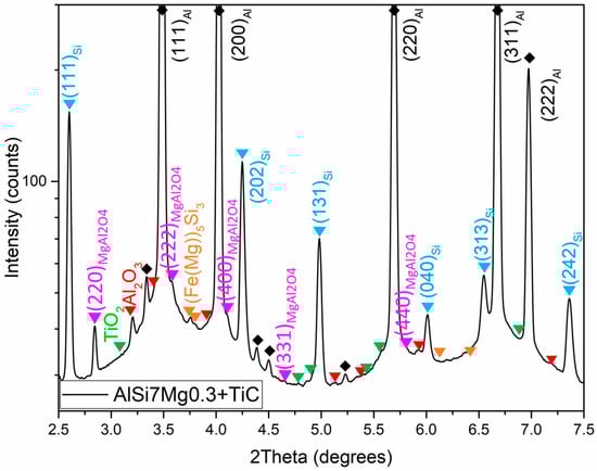 | AlSi7Mg0.3 0.1 wt.% TiC | 7.42 | 0.11 | <0.1 | <0.1 | 0.32 | <0.1 | 0.23 | <0.02 | Bal. |