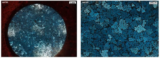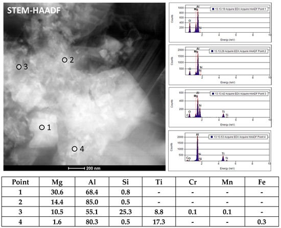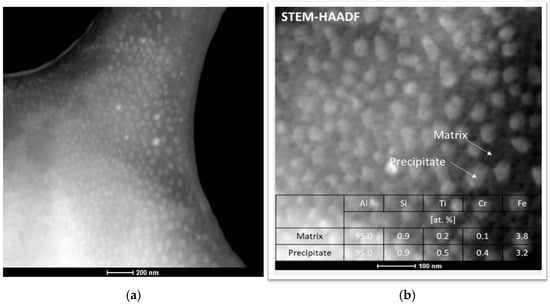 - Areas containing homogeneously distributed spherical precipitates, approximately 50 nm in size and enriched in Ti and Cr (Al 95.5%, Si 0.9%, Ti 0.5%, Cr 0.4%, and Fe 3.2%), were observed. The precise effect of such particle agglomeration on the properties of the final material was not determined; however, these regions may have acted as stress concentration sites (Figure 5).