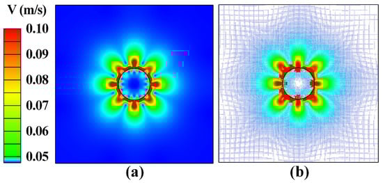 Velocity contour (a) and velocity vector (b) of gas near static high-temperature droplet (the black circle represents the gas–liquid interface).