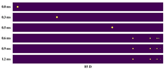 We considered a case with specific conditions as an example to investigate the cooling and solidification characteristics of the molten droplet in the moving gas. The fundamental parameters were as follows: a gas velocity of 100 m/s, a gas temperature of 300 K, a droplet diameter of 100 μm, and an initial droplet temperature of 1033 K. Figure 4 illustrates the motion and breakup process of the droplet within the computational domain, with the yellow region representing the droplet phase and the purple region representing the gas phase. As time progressed, the stationary molten droplet was transported downstream by the flowing gas. At 0.3 ms, the molten droplet showed no discernible deformation. However, at 0.5 ms, the droplet underwent significant deformation, and the gas phase was entrapped within the droplet. By 0.6 ms, the original molten droplet had broken up into smaller droplets. After 0.6 ms, the newly formed sub-droplets gradually assumed a spherical shape while maintaining their position within the calculation domain relatively unchanged. The specific reasons for these observations are discussed below.