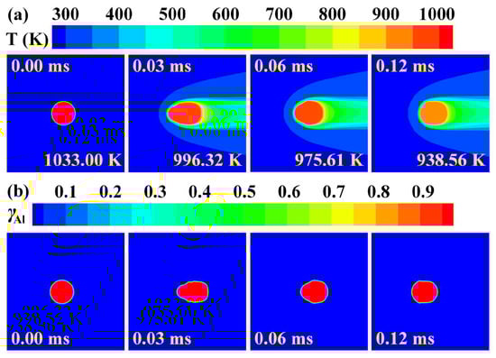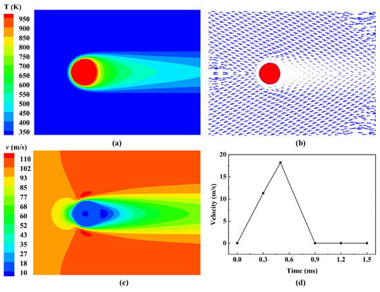 Figure 5a–c depict the temperature contour, velocity vector, and velocity contour of the flying droplet and its surrounding region at 0.3 ms. The temperature of the droplet was above 950 K, and gas flowed towards it from the left side at a certain velocity, exchanging thermal energy with the droplet (Figure 5a). Over time, this convection heat exchange between the droplet and the flowing gas continued, causing the temperature of the droplet itself to decrease and the temperature of nearby gas to increase, particularly on the right side of the droplet, where a discernible temperature gradient formed. Meanwhile, an exchange of momentum also took place: under the influence of the moving gas, the droplet transitioned from a static state at the initial moment to a moving state (with a velocity above 10 m/s) at the current moment, as depicted in Figure 5c. Furthermore, as the heat transfer process between the gas and the molten droplet continued, the latter gradually solidified (after 0.6 ms), and the velocity of the solidified particles tended towards 0 m/s, as determined with the algorithm of Fluent 2020 R2 (Figure 5d).