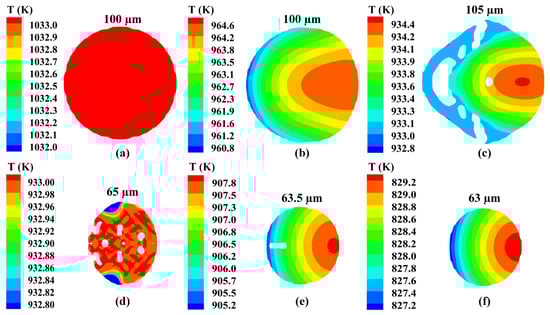Figure 6 illustrates the temporal evolution of the temperature and size of the molten droplet during the flight heat transfer process, while Figure 7 demonstrates the variation in the liquid-phase fraction of the molten droplet over time, providing a visual insight into the solidification process of the molten droplet. Based on Figure 6, it is evident that at the initial moment, the temperature of the droplet was 1033 K, indicating its liquid state (with a liquid-phase fraction of 1), and its diameter was 100 µm, assuming a circular shape. With the convective heat transfer occurring between the gas and the droplet, the temperature of the latter decreased, resulting in an internal temperature gradient. The gas velocity near the left side of the droplet was greater, facilitating a more efficient heat exchange between the droplet and the gas, i.e., leading to a lower temperature, on this side. Additionally, due to the influence of the gas, the droplet underwent continuous shape deformation. At 0.3 ms, the molten droplet experienced a temperature decrease to approximately 960 K with slight deformation, yet maintained a size of 100 µm. At this moment, its temperature had not yet reached the liquidus temperature. At 0.5 ms, the temperature range of the droplet was 932.8 K to 934.4 K, with certain areas on the left side of the droplet exhibiting lower temperatures than the liquidus temperature (933 K), indicating the initiation of solidification (as shown in Figure 7c). Additionally, there was trapped gas within the molten droplet. At this stage, the droplet had not yet broken up, but due to the presence of internal gas, the size of the droplet had increased to 105 µm. With time progression, at 0.6 ms, the droplet underwent breakup into multiple smaller droplets (refer to Figure 4) among which the larger one is depicted in Figure 6 and Figure 7, measuring approximately 65 µm in size. At this point, the internal temperature of the droplet remained at around 933 K. However, compared with the conditions at 0.5 ms, the liquid phase within the droplet further decreased, and solidification occurred at the edges of the droplet. In the time interval of 0.5~0.6 ms, there was no significant decrease in the temperature of the droplet due to the substantial release of latent heat during its solidification. Once the latent heat was entirely released, the droplet solidified completely and transformed into a solid particle, continuing to exchange heat with the surrounding gas and further cooling, as indicated by the conditions at 0.9 ms and 1.2 ms depicted in Figure 6 and Figure 7.