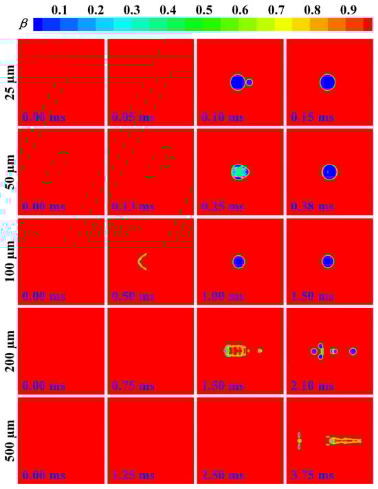 Figure 9 illustrates the temporal evolution of the liquid-phase fraction during the flight heat transfer of droplets with different diameters. It is evident that the droplet with a diameter of 25 µm had solidified completely by 0.10 ms, whereas for the droplet with a diameter of 50 µm, only a thin shell had formed on the surface by 0.25 ms, leaving a significant portion of the droplet’s interior in a liquid state; the complete solidification of the latter occurred within the time interval of 0.25–0.38 ms. As the droplet diameter increased, the duration needed for complete solidification also increased. When the droplet diameter was 100 µm, solidification only occurred on the left surface after 0.50 ms, and it took around 1.00 ms for the entire droplet to fully solidify. For the droplet with a diameter of 200 µm, severe deformation and breakup occurred after 1.50 ms, accompanied by observable liquid structures such as droplets and liquid ligaments in the solidification process; at 2.10 ms, the liquid ligament structure disappeared, and spherical droplets of varying sizes formed, indicating complete solidification. However, for the droplet with a diameter of 500 µm, even after 3.75 ms had passed, the droplet had not yet completed the solidification process and had instead broken up into complex liquid ligament structures that had started to solidify.