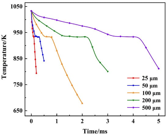 The variation in the central temperature of the molten droplet with time for different droplet diameters is depicted in Figure 10. It can be observed that as time progressed, the temperature at the center of the droplet decreased. Furthermore, an increase in the droplet diameter led to a longer cooling duration for the droplet to reach the liquidus temperature, resulting in a reduction in its cooling rate. The molten droplets with the diameters of 25 µm and 500 µm took 0.08 ms and 3.5 ms, respectively, to cool down to a temperature of 935 K. The latter required approximately 43.75 times more time to reach this temperature than the former.