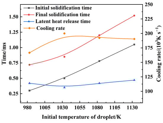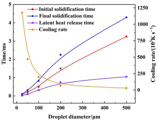 Figure 11 illustrates the trend in the initial and final solidification times, latent heat release time, and cooling rate as a function of the droplet diameter. To avoid interference from droplet breakup when determining the averaged droplet cooling rates, this study focused on the cooling rate of droplets within the range from the initial temperature to the liquidus temperature (when droplets start to solidify). It was evident that as the droplet size increased, both the initial and final solidification times were delayed, the latent heat release time increased, and the cooling rate decreased. For the droplet diameters of 25, 50, 100, 200, and 500 µm, the initial solidification times were 0.09, 0.21, 0.5, 1.5, and 3.25 ms, respectively, and the final solidification times were 0.11, 0.31, 0.85, 2.25, and 4.30 ms, respectively. Correspondingly, the latent heat release times were 0.02, 0.10, 0.35, 0.75, and 1.05 ms, and the cooling rates were measured as 1.18 × 106, 4.71 × 105, 2.00 × 105, 6.67 × 104, and 3.08 × 104 K/s, respectively. Clearly, the droplet size had a significant impact on the cooling rate. In comparison with a droplet measuring 500 µm in diameter, the cooling rate for one measuring 25 µm was approximately 38.31 times faster. This phenomenon can be attributed to both the larger volume and higher enthalpy within the larger droplets, which necessitate more latent heat release during their solidification process. As such, the cooling rates of larger molten droplets were relatively slow.