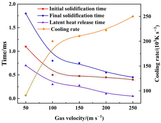 The influence of the gas velocity on the cooling and solidification behavior of flying molten droplets is depicted in Figure 12. It can be observed that as the gas velocity increased, both the initial and final solidification times of the droplet occurred earlier, resulting in a shortened duration for latent heat release and an accelerated cooling rate. When the gas velocity was increased from 50 m/s to 250 m/s, the initial solidification time of the droplets was brought forward from 1.10 ms to 0.40 ms, reducing the duration for latent heat release from 0.7 ms to 0.05 ms and increasing the cooling rate from 9.09 × 104 K/s to 2.50 × 105 K/s. Notably, when the gas velocity was increased from 50 m/s to 250 m/s, the cooling rate increased by 2.75 times. Furthermore, as the gas velocity continued to increase, its impact on the cooling rate gradually diminished.