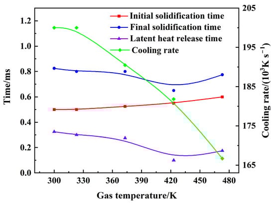 Figure 13 illustrates the influence of the gas temperature on the cooling and solidification process of flying molten droplets. It is apparent that as the gas temperature increased, the initial solidification time of the droplets was delayed. Specifically, at gas temperatures of 300, 323, 373, 423, and 473 K, the initial solidification times were 0.50, 0.51, 0.53, 0.55, and 0.60 ms, respectively. This can be attributed to the decrease in the heat transfer rate before solidification as the gas temperature increased. Furthermore, the cooling rate of the droplet decreased with the increase in the gas temperature. Specifically, at 300 K and 473 K, the cooling rate was approximately 2 × 105 K/s and 1.67 × 105 K/s, respectively. It can be concluded that the effect of the gas temperature on the cooling rate was limited.