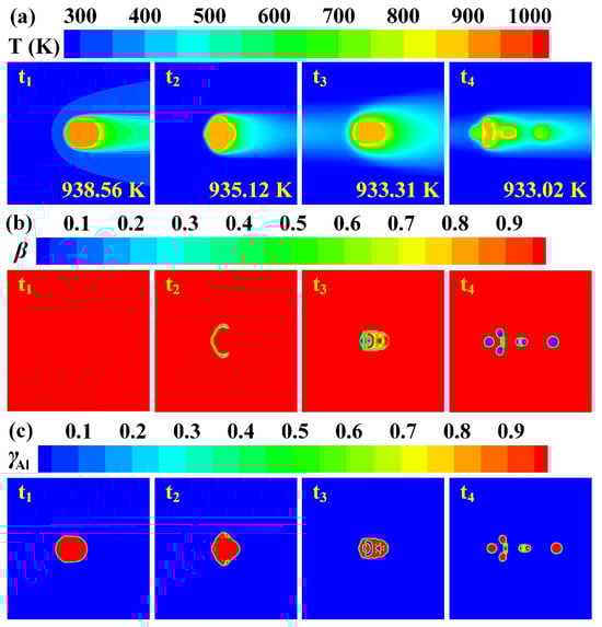 The formation of hollow powder is illustrated in Figure 17, where β represents the liquid-phase fraction and γAl represents the volume fraction of the droplet. In the figure, t1, t2, and t3 correspond to the three time points of hollow powder formation, while t1*, t2*, and t3* denote those of non-hollow powder, with the asterisk (*) distinguishing the cases, as they occurred at different time points. Figure 17a depicts the process of the molten droplet transforming into hollow powder during solidification. Specifically, in the process of heat exchange with the moving gas, the molten droplet was cooled to a temperature near the liquidus temperature and initiated solidification. During solidification, gas was entrapped within the droplet. Once fully solidified, the trapped gas remained within the solidified particle, resulting in the formation of hollow powder. However, during the solidification process of the droplet, if there is incomplete closure of the solidification layer on the droplet surface (at t2* in Figure 17b), gas may escape from inside the droplet, resulting in a failure to ultimately form hollow powder, as depicted at t3* in Figure 17b.