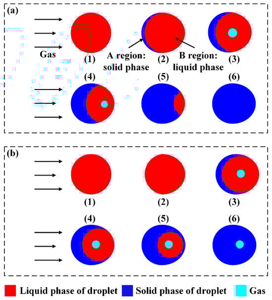 The formation mechanism of hollow powder is illustrated in Figure 18. As depicted in Figure 18(a1), the initial temperature of the droplet exceeded the liquidus temperature. Through heat exchange with the moving gas, the upwind side of the droplet solidified first, as shown in Figure 18(a2). With ongoing heat transfer, the solidified region (A) acted as a solid obstacle for the incoming gas. The incoming gas circumvented region A and interacted with the fluid in region B (liquid-phase region). Under complex turbulence, it was possible for the gas to be entrapped within the liquid phase of region B, as demonstrated in Figure 18(a3). As solidification progressed, the solidification zone expanded towards the right and inside the droplet. The complex turbulent flow and gas–liquid interaction in region B may result in the potential expulsion of gas in the molten droplet, depending on the solidification state of the liquid surface layer within this zone. If such solidification proceeds at a slow rate, there is a possibility that gas escapes prior to the formation of a fully closed solidification shell on the surface layer of the droplet, resulting in the failure of hollow powder formation, as depicted in Figure 18(a4–a6). The formation of the hollow powder is illustrated in Figure 18b. Under the effect of the gas flow, the droplet gradually moved downstream within the computational domain. During this process, the windward side of the droplet progressively solidified while gas was entrapped within the liquid phase region (Figure 18(b1–b3)). As heat exchange between the gas and droplet continued, the solid phase region of the droplet gradually expanded (Figure 18(b4)). If the liquid in the surface layer of region B solidifies rapidly, a closed solidification shell forms on the surface layer of the droplet, preventing gas from escaping (Figure 18(b5)). Once the droplet fully solidifies, the gas is trapped inside the solid particle, resulting in the formation of hollow powder (Figure 18(b6)).