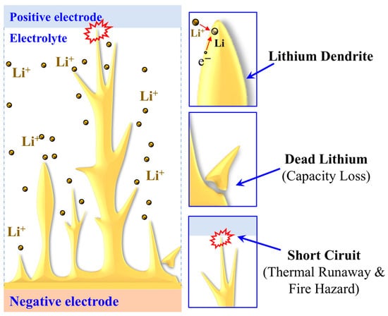 During charge-discharge cycling, uneven deposition of lithium-ions on the surface of the metallic lithium electrode is the root cause of lithium dendrite initiation. When micro-protrusions or defects exist on the electrode surface, the local electric field and lithium-ion flux distort, creating conditions for instability. According to the space charge model [13], the depletion of anions near the anode surface generates a steep electric field gradient. This drives the lithium-ion to recombine with electrons, forming nascent dendrites that continue to nucleate and grow. Meanwhile, if lithium-ion migration in the electrolyte lags behind the plating reaction rate, the local lithium-ion concentration approaches zero, thereby accelerating dendrite formation. The uncontrolled dendrite formation gives rise to multiple adverse consequences, including reducing the Coulombic efficiency, stripping the interface between the solid electrolyte and the electrode, and forming “dead lithium”. More critically, uncontrolled dendrite growth can puncture the solid electrolyte, which causes an internal short circuit and even triggers thermal runaway [14,15], as shown in Figure 1.