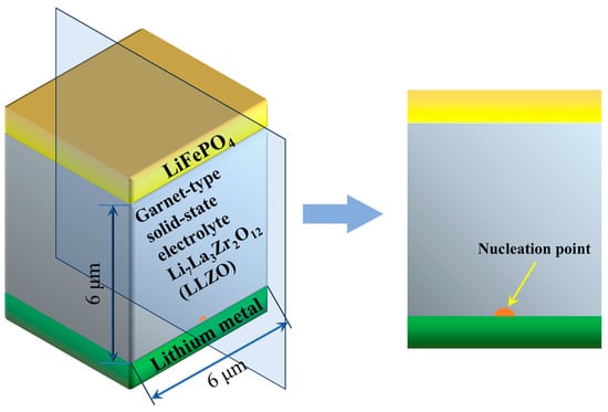 The size of the finite element model is 6 μm × 6 μm. At the bottom position of the model is the negative electrode, and the material is lithium metal. The top position is set for the positive electrode, made of lithium iron phosphate (LiFePO4). In order to facilitate the observation of the inhibition of dendrite growth by the mechanical strength of the electrolyte, the Garnet-type solid-state electrolyte Li7La3Zr2O12 (LLZO) is used in the middle position. The nucleation site of lithium dendrites is set at the center of the lithium electrode to ensure the uniform growth of dendrites. The phase field simulation parameters of the lithium dendrite growth model are shown in Table 1. Furthermore, the initial values of the phase field equation are set through the Step Function module in COMSOL Multiphysics software. The nonlinear phase field control equation, concentration conservation equation, potential distribution equation, and temperature control equation are defined by Equations (9), (12), (13), and (15), respectively. The equation template obtained according to the General Form PED (g) module is and , where Γ is the conserved flux, f is the source item, da is the damping coefficient, ea is the mass coefficient. The differential equations in the template are set. The conserved fluxes corresponding to Equations (9), (12), (13), and (15) are , , , and , respectively. Similarly, the source items are , , , and , respectively. Damping Coefficients da are 1, 1, 1, and Cpρ, respectively. The mass coefficient ea is 0. The strain tensor is . The settings of the initial values and Dirichlet boundary conditions are shown in Table 2. In the present work, both the lithium metal and the solid-state electrolyte are modeled as small-strain, isotropic linear elastic materials, and plastic deformation and explicit fracture of either phase are not included. This choice allows us to focus on the effects of coupled electrochemical-mechanical-thermal fields and different initial nucleation geometries on the early-to-intermediate stages of dendrite evolution with a limited number of material parameters.
