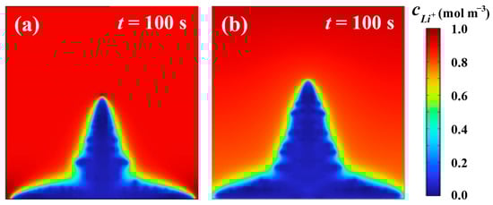 A dendrite growth model under the same research conditions as Wen et al. [34] is established. The lithium dendrites are relatively short with a height of 3.82 μm at an ambient temperature of 293.15 K. A comparison of lithium-ion concentration between present simulation results and previous results at 293.15 K and a potential difference of 0.1 V for 100 s is shown in Figure 4. In this paper, the lithium-ion concentration distribution under the same conditions is also established, as shown in Figure 4b. The height of the lithium dendrite is 4.04 μm at the same ambient temperature. The error between the previous result and the current result is 5.45%. By comparison, it can be found that the lithium-ion concentration distribution established by the two is basically the same. This consistency confirms that the model can provide reliable and suitable results for simulating lithium dendrite growth.