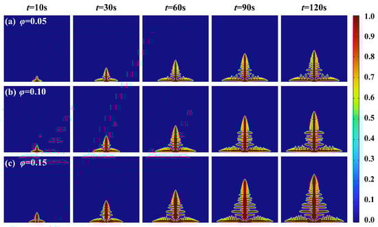 Lithium dendrite growth morphology under different electric potentials: (a) φ = 0.05 V; (b) φ = 0.10 V; (c) φ = 0.15 V.