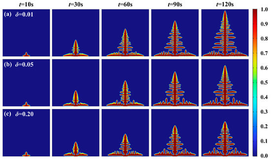 The anisotropy strength is one of the key physical parameters that affect the growth morphology and orientation of lithium dendrites. Especially in the solid electrolyte systems, it interacts with the elastic modulus of the electrolyte and exerts a significant regulatory effect on the tip splitting and trunk growth of dendrites [35]. Phase-field simulations have shown that solid electrolytes with high anisotropic moduli can effectively hinder the mechanical penetration of lithium dendrites. Based on this mechanism, incorporating MXene nanosheets into the lithium metal anode can establish an MXene-bonded transport network, enhancing the mechanical strength of the electrolyte and suppressing dendrite propagation [36]. According to the free energy functional theory, the anisotropy of surface energy plays a critical role in determining the direction of lithium deposition. To investigate the effect of anisotropy intensity on dendrite morphology, simulations are conducted using COMSOL Multiphysics 6.0 with δ values set at 0.01, 0.05, and 0.20, respectively. The lithium dendrite growth morphology under varying anisotropic intensities at different time intervals is presented in Figure 6. The maximum longitudinal growth rate decreases 47% (from 0.042 to 0.022 μm/s) by anisotropic intensity from 0.20 to 0.01, attributed to stress-induced reduction in effective diffusion coefficient and increased interfacial resistance.