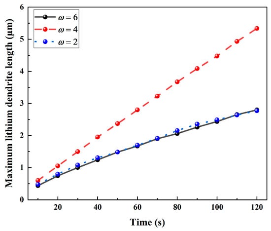 The anisotropic modulus also exerts a significant influence on the formation and growth of lithium dendrites. As evident from the phase field equation above, these anisotropic moduli directly affect the gradient coefficient, which in turn is incorporated into the phase field model governing lithium dendrite growth within solid-state electrolytes. Therefore, this section investigates the influence of different anisotropic moduli on the phase field model of lithium dendrites in solid-state electrolytes. Specifically, the anisotropic modulus is adjusted in the lithium dendrite phase field model within the electrolyte and set to ω = 2, ω = 4, and ω = 6 for analysis, respectively. When the anisotropic modulus is set to 2, the dominant growth direction of the dendrite is oriented horizontally. With an anisotropic modulus of 4, the dominant growth directions occur at 0°, 90°, 180°, and 360°. When the anisotropic modulus is set to 6, the dominant growth directions are 0°, 60°, 120°, 180°, 240°, and 360°. The corresponding lithium dendrite growth morphology under different anisotropic moduli is presented in Figure 7. Since the nucleation points are defined at the bottom, the growth direction of the dendrites is in a 0° to 180° angular range. As can be seen from Figure 7, adjusting the anisotropy modulus can exert a discernible inhibitory effect on the growth of lithium dendrites, which is particularly more pronounced along the vertical direction. The results of the numerical simulation show that the growth height of the longitudinal dendrites with ω = 6 (the preferred growth direction of hexagonal shape) is 18% less than that of ω = 2 and 49% less than that of ω = 4 (Figure 7). This can be achieved by doping LLZO electrolytes with Mg2+ or Al3+, which modify crystal orientation and increase anisotropic modulus.