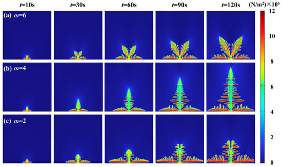 Furthermore, based on the phase-field model coupled with mechanical stress, this study analyzes the von Mises stress distribution resulting from different anisotropic moduli under varying preferred growth directions, as presented in Figure 9. The von Mises stress distribution visually illustrates the correlation between anisotropic moduli and stress localization. For the highly anisotropic lithium dendrites, the von Mises stress concentrates at the tip regions and directional bifurcations; for the moderately anisotropic dendrites, it is predominantly localized at the main stem tips; whereas in low anisotropy dendrites, the von Mises stress is widely dispersed throughout the multi-branch regions. This phenomenon reveals the regulation of anisotropic moduli on the feedback mechanism between stress and dendrite growth. The vertical growth region not only serves as an active site for rapid lithium-ion deposition but also represents a mechanically sensitive zone during dendrite evolution. By modulating the location and magnitude of von Mises stress concentration, anisotropic moduli further influence the growth kinetics of dendrites.
