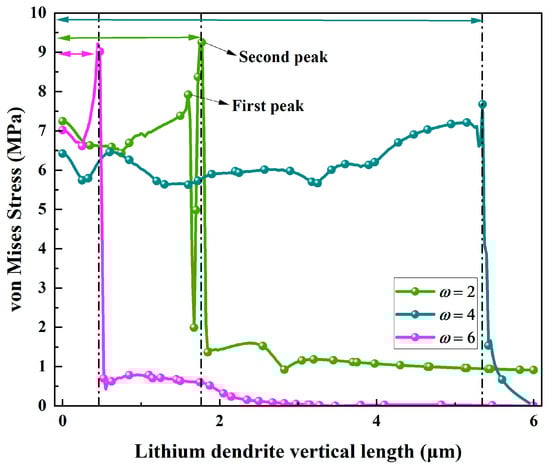 The influence of anisotropic moduli on the mechanical behavior of lithium dendrites is further quantified in Figure 10 by analyzing the evolution of von Mises stress with respect to the vertical length of the dendrites. When the anisotropic modulus is set to 6, an initial stress peak of 9.22 MPa occurs as the lithium dendrite vertical length reaches 0.45 μm, after which the stress rapidly decays to near-zero levels. This behavior is attributed to the directional branching morphology resulting from the high anisotropy modulus. The regular growth pattern minimizes the accumulation of disordered stress, thereby enhancing the mechanical stability of dendrites and effectively suppressing the risk of electrolyte penetration due to stress concentration. When the anisotropic modulus is set to 4, the von Mises stress remains at a relatively high level of 5.67–7.68 MPa as the lithium dendrite vertical length increases from 0 μm to 5.35 μm. A pronounced stress peak emerges in the later stage, reflecting the mechanical behavior characteristic of main trunk dendrite growth: the longitudinal extension of the main trunk continuously accumulates stress, while the development of secondary branches further intensifies stress concentration. This stress behavior increases the possibility of dendrites penetrating the electrolyte. When the anisotropic modulus is set to 4, the von Mises stress is at a relatively high level of 6.15–6.97 MPa as the lithium dendrite vertical length increases from 0 μm to 0.73 μm. As the lithium dendrite vertical length reaches 1.60 μm, the stress attains its first peak of 7.71 MPa. When the dendrite length further increases to 1.75 μm, a second stress peak of 9.17 MPa is observed. During these stages, the stress exhibits significant fluctuations, and the multi-peak characteristics observed in the early and middle stages align well with the disordered multi-branched moss-like morphology of the dendrites. Frequent tip splitting and disordered growth lead to repeated cycles of stress concentration and release. The residual stress eventually indicates that the mechanical stability of such dendrites is the lowest.