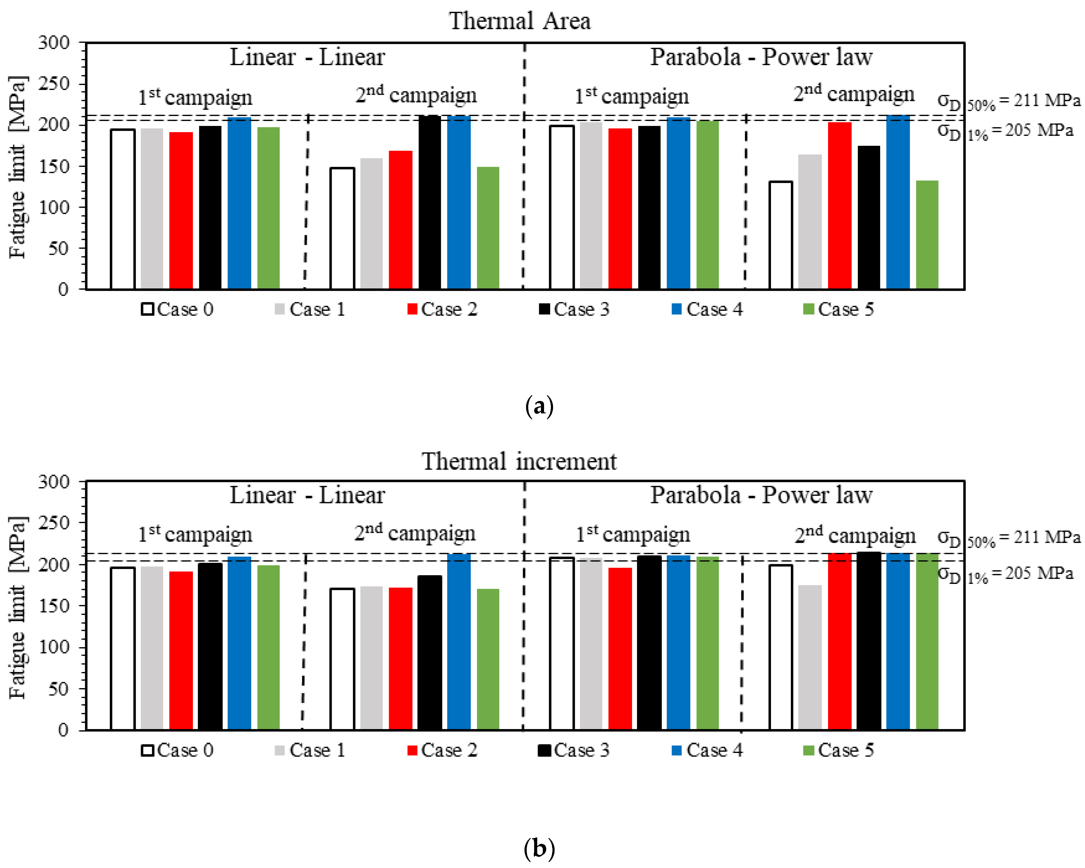 - La Rosa, G.; Risitano, A. Thermographic methodology for rapid determination of the fatigue limit of materials and mechanical components. Int. J. Fatigue 2000, 22, 65–73. [Google Scholar] [CrossRef]