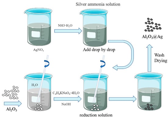 It mainly includes the following steps: (1) Preparation of silver-ammonia solution: Dissolve 20 g of silver nitrate in 500 mL of deionized water, slowly add 30 mL of ammonia solution to the solution while stirring continuously. The solution will initially become turbid and then gradually become clear and transparent. Add deionized water to make a total volume of 1 L. (2) Preparation of reducing solution: Add 8 g of Alumina to a beaker, then add 500 mL of deionized water. Use magnetic stirring to ensure complete dispersion of Alumina in the water. Add 100 g of potassium sodium tartrate and dissolve completely while stirring with a magnetic stirrer. Add deionized water to make a total volume of 1 L. (3) Chemical silver plating: To investigate the effect of temperature on silver plating on the surface of alumina, the experiment is conducted at 25 °C, 30 °C, and 40 °C while keeping other parameters constant. The silver–ammonia solution is added dropwise into the reducing solution at a rate of 200 mL/min, while the alumina is kept suspended in the solution by magnetic stirring. The reaction starts immediately upon the addition of the solution, and the milky white solution gradually turns dark brown and then silver-gray. The reaction stops once all the solutions are added. A faint silver mirror reaction can be observed on the walls of the beaker. A small amount of the solution is added to hydrochloric acid, and no white precipitate is formed. Then, the solution is filtered and washed repeatedly with deionized water and anhydrous ethanol until the pH value approaches neutral. Finally, the alumina coated with silver powder (Al2O3@Ag) is obtained by vacuum drying at 60 °C.