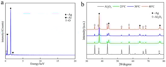 EDS spectra and XRD patterns of silver-plated alumina. (a) EDS spectra and (b) XRD patterns of silver-plated alumina at different temperatures.