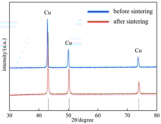 XRD analysis was performed on the Al2O3@Ag/Cu composite material, and the results are shown in Figure 5. From the figure, all peaks correspond to the characteristic peaks of Cu, and a comparison with the standard PDF card indicates that the characteristic peak positions of the composite powder before sintering correspond one-to-one with those of the PDF card. After sintering, a blue shift in the characteristic peaks of the composite material appears. This phenomenon is caused by the diffusion of silver atoms from the coating into the Cu lattice during sintering, resulting in lattice expansion and a consequent shift of the diffraction peaks towards lower angles [28]. Meanwhile, we calculated the lattice constants of the composite material before and after sintering, which were 3.6286 Å and 3.64276 Å, respectively, consistent with the above theory.