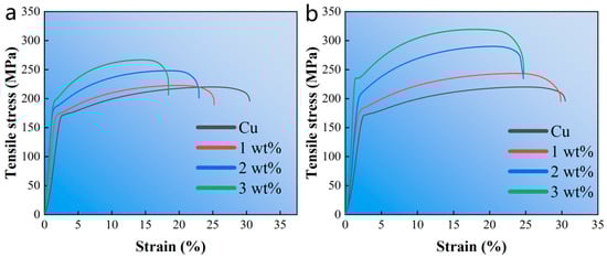 The engineering stress–strain curves of specimens. (a) Al2O3/Cu composites with different Al2O3 content; (b) Al2O3@Ag/Cu composites with different Al2O3@Ag content.