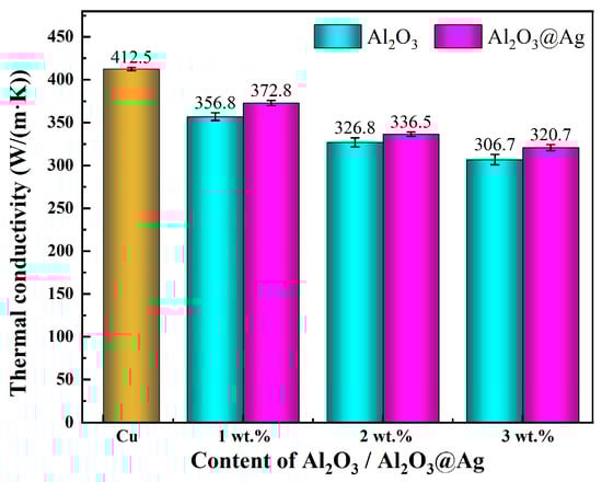 Figure 7 shows the statistical chart of thermal conductivity of Al2O3@Ag/Cu and Al2O3/Cu composite materials with varying alumina content. From the graph, the following observations can be made: (1) With increasing alumina content, the thermal conductivity of both composite materials decreases. This is because, on one hand, as the alumina content increases, the relative density of the composite material gradually decreases, resulting in small pores between the alumina and Cu matrix, creating thermal insulation barriers that increase the interfacial thermal resistance between the alumina and Cu. On the other hand, the introduction of alumina leads to the formation of more bonding interfaces within the composite material, which further increases the interfacial thermal resistance and results in a decrease in thermal conductivity. (2) Under the same alumina content, the thermal conductivity of the Al2O3@Ag/Cu composite material is significantly higher than that of the Al2O3/Cu composite material. When the alumina content reaches 3%, the thermal conductivity of the Al2O3/Cu composite material is 306.7 W/(m∙K), which is only 74.4% of pure Cu, while the thermal conductivity of the Al2O3@Ag/Cu composite material is 320.7 W/(m∙K), reaching 77.8% of pure Cu. This phenomenon can be attributed to the silver-plating treatment on the surface of the alumina [30]. The addition of Ag as an impurity increases the number of free electrons, enhances the conduction path of free electrons, and strengthens phonon scattering, thereby increasing the electrical and thermal conductivity. Additionally, the inclusion of Ag improves the densification of the composite material, which has a positive effect on phonon conduction.