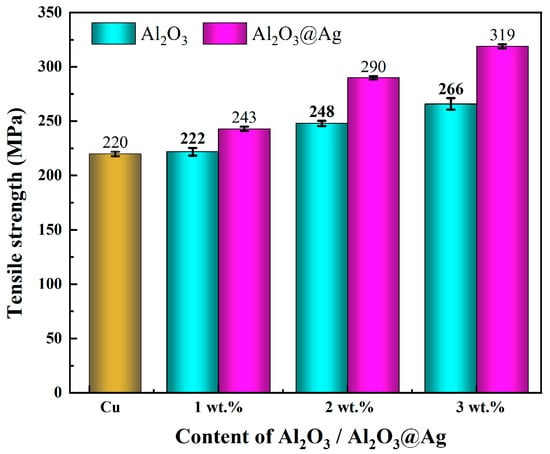 Figure 8 shows the tensile strength of Al2O3/Cu and Al2O3@Ag/Cu composite materials with different alumina contents. When the alumina content reaches 3 wt.%, the tensile strength of the untreated composite material is 266.35 MPa, which is approximately 21.1% higher than that of the Cu matrix. The silver-plated composite materials exhibit even higher tensile strength. When the alumina content reaches 3 wt.%, the tensile strength of the Al2O3@Ag/Cu composite material is 318.56 MPa, which is approximately 19.6% higher than the untreated material and approximately 53.9% higher than the Cu matrix.