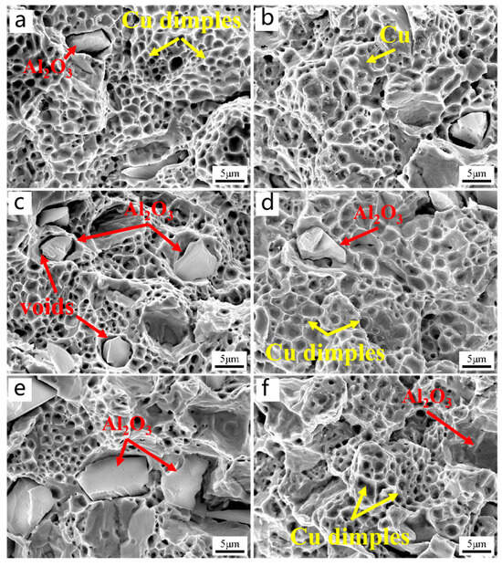 To further investigate the strengthening mechanism of the two types of composite materials, the microstructure of the tensile fracture surface was observed. Figure 9a,c,e shows the microstructures of the tensile fracture surfaces of Al2O3/Cu composite materials with different alumina contents. It can be seen that the fracture surfaces are mainly ductile fracture surfaces, indicating that the fracture mode is mainly ductile fracture. The alumina particles are either completely embedded in the Cu matrix or completely pulled out. The ductile dimples around the alumina particles are relatively flat, which is because the interface binding between the two materials is weak, and the load transmission is subject to less surrounding dislocation bending. Figure 9b,d,f shows the microstructures of the tensile fracture surfaces of Al2O3@Ag/Cu composite materials, which also exhibit ductile fracture.
