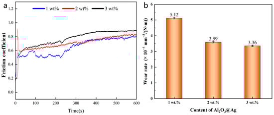 (a) Friction coefficient and (b) wear rate of Al2O3@Ag/Cu composites with different Al2O3@Ag content.