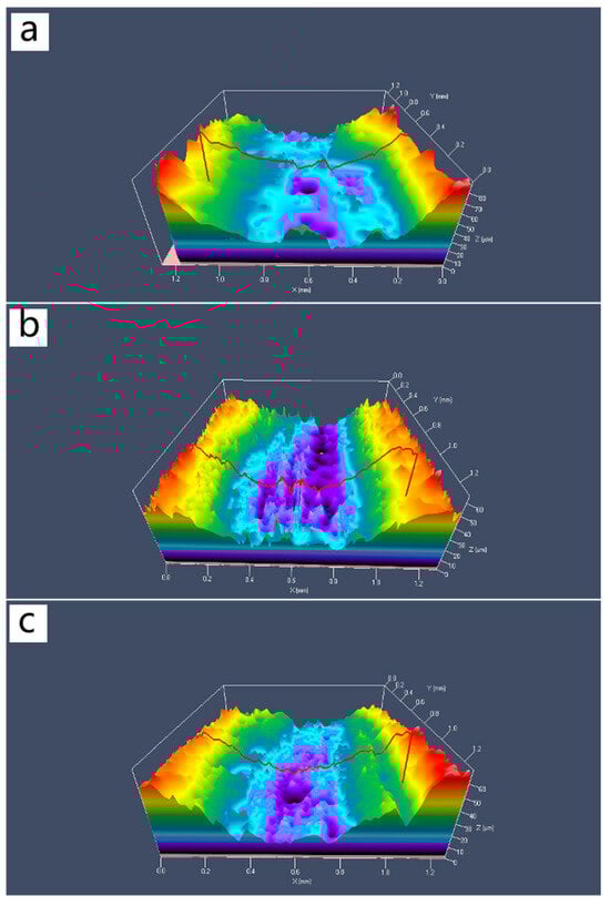Three-dimensional wear morphology of Al2O3@Ag/Cu composites. The contents of Al2O3@Ag are (a) 1 wt.%, (b) 2 wt.%, and (c) 3 wt.%.