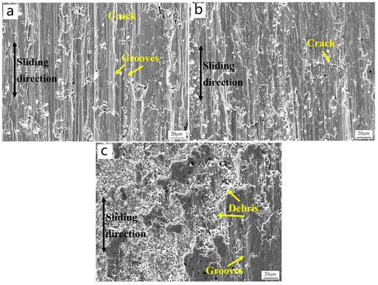 As shown in Figure 12a, when the alumina content is 1 wt.%, the main feature of the worn surface is deep furrows and a small number of spalling pits. This is because when the alumina content is low, alumina cannot provide sufficient support, and a large amount of Cu falls off along the friction direction. At the same time, under the action of normal load, plastic deformation occurs on the surface of the composite material, forming furrow-shaped wear. At this time, the primary wear mechanism is furrowing wear. As the alumina content gradually increases, reaching 2 wt.%, as shown in Figure 12b, the surface furrows become shallower, and spalling pits appear on the worn surface. This is because the supporting role of alumina in the composite material gradually appears, the surface deformation decreases, and the material peels off along the defect at the interface. Currently, the primary wear mechanism is spalling wear. When the alumina content reaches 3 wt.%, as shown in Figure 12c, a large amount of debris can be observed on the surface. This is because ceramic particles can be divided into two processes during friction: One is that alumina particles are embedded into the composite material under the action of normal load and undergo micro-cutting of the soft matrix on the surface of the composite material under the action of transverse shear force [33]. In addition, alumina particles are exposed on the surface, which hinders the micro-cutting of the abrasive and reduces the wear rate of the composite material. Consequently, the wear mechanism is debris wear and spalling wear.