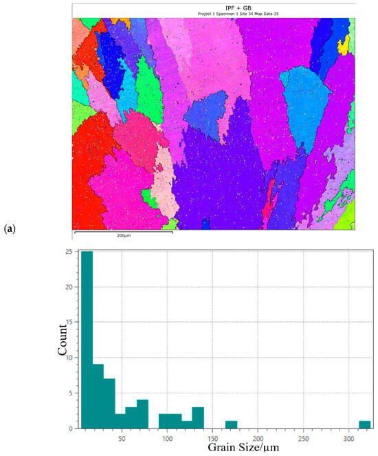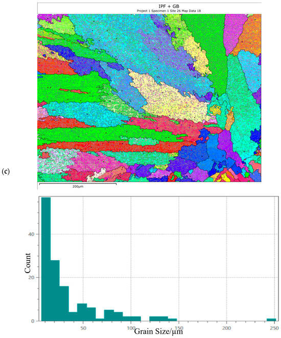 EBSD micrographs and grain size distribution maps under different step distances: (a) unprocessed, (b) step size of 0.12 mm, (c) step size of 0.06 mm.
