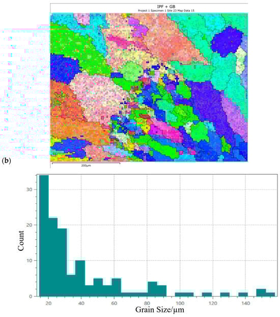 To investigate the grain refinement phenomenon, the samples were characterized using electron backscatter diffraction (EBSD) in conjunction with a scanning electron microscope operated at low acceleration voltage and short working distance, supplemented by a high-sensitivity backscattered electron detector to improve signal resolution and orientation indexing accuracy.