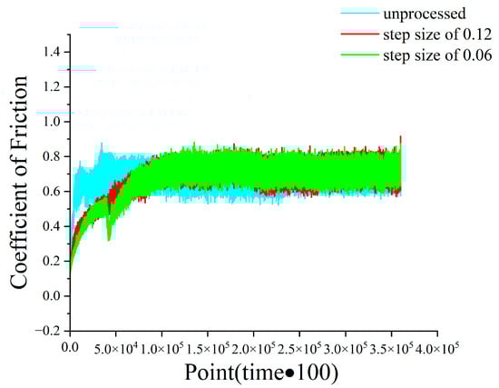The unprocessed state is achieved after 500 s for the unprocessed sample, 1000 s for the sample treated with a 0.12 mm step-over distance, and 1200 s for the sample treated with a 0.06 mm step-over distance. The corresponding stabilized friction coefficients are 0.672, 0.663, and 0.655, respectively. Notably, the sample processed with the 0.06 mm step-over distance exhibits the smallest fluctuation amplitude during the steady state, indicating superior sliding stability.
