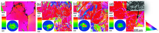 IPF maps for the AXM-rolled samples (DSR 4:2 at 400 °C) in Figure 1 show a thickness reduction at (a) 10%, (b) 20%, (c) 30%, and (d) 40% with a magnification of 500× where the development of DRX grains is shown. The IPF maps demonstrate that few DRX grains present at 10% (as similar to the original solution treated T4) and an increasing number of DRX grains present at 40%. The average grain size at 10% reduction was 31.9 ± 28.2 μm, decreasing to 19.5 ± 14.2 μm at 40% reduction, with the DRX area fraction doubling from 10 to 40% reduction following DSR [23,26]. An inset band contrast image showing the fine DRX grains is provided in Figure 1d. The associated pole figures are also positioned in the corners, showing the basal texture increased as the thickness reduction increased.
