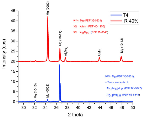 The XRD scan comparing the original solution-treated (T4) condition to the DSR at 40% can be seen in Figure 2. The scan shows that the T4 shows 97% magnesium phase with only trace amounts (less than 3%) of secondary phases. In comparison, the DSR at 40% reduction shows 6% of secondary phases, with Al-Mn also being one of the main secondary phase constituents after rolling. Also, the intensity of the (0002) peak did increase for the rolled material, as compared to the T4 initial condition due to the strengthening of the basal texture after rolling, and this is consistent with EBSD data.