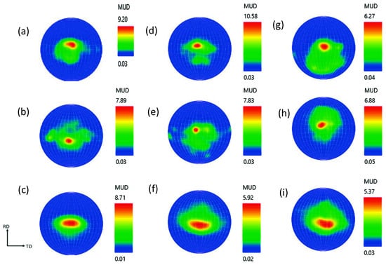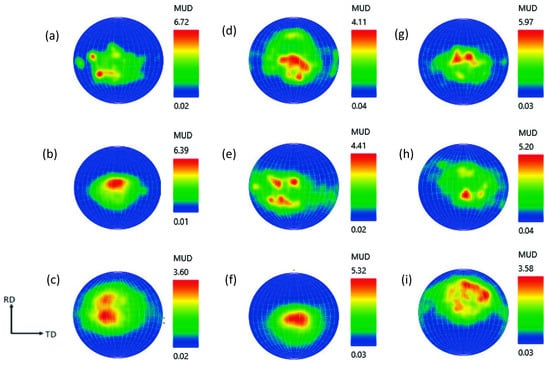 Pole figures for AXM20504 (DSR 4:2 m/min and 20% reduction) after post-annealing, showing the orientation spreading and evolution (scan taken at 50×) at 350 °C for (a) 20 min, (b) 40 min, (c) 60 min; 400 °C for (d) 20 min, (e) 40 min, and (f) 60 min; and at 450 °C for (g) 20 min, (h) 40 min, and (i) 60 min.