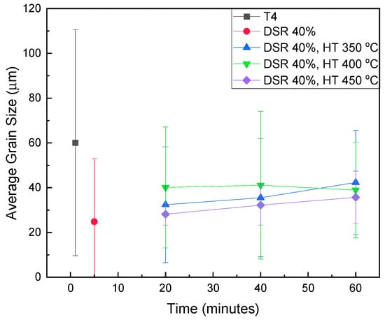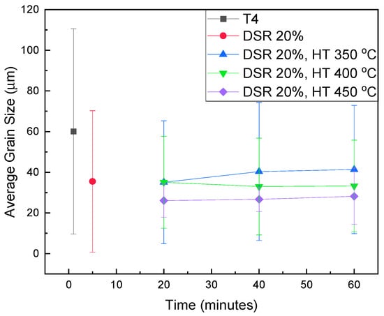 The average grain sizes for the AXM20504 for the post-annealed samples at given durations and temperatures are shown in Figure 5. The original grain size (T4) is 60 μm, which is reduced to 35 μm at a DSR 20% reduction. There is a marginal difference in grain size for the annealed conditions but a slight reduction in grain size for the higher temperature at 450 °C, demonstrating that the recrystallization process aided in normalizing and generating a more uniform grain size.