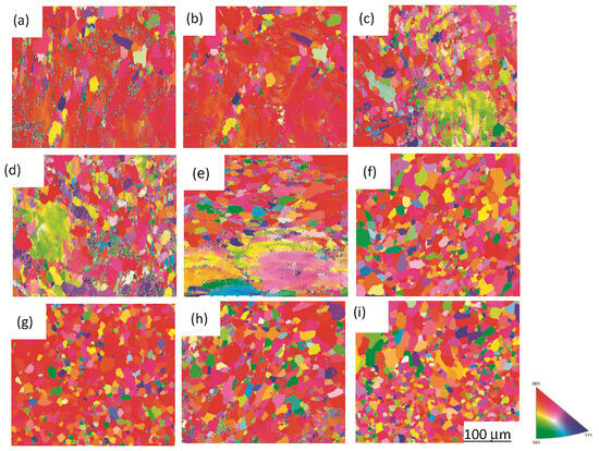 IPF maps showing the grain refinement evolution for AXM20504 (DSR 4:2 m/min at 400 °C and 20% reduction) after post-annealing with the combination of temperatures and durations at 350 °C, for (a) 20 min, (b) 40 min, and (c) 60 min; at 400 °C, for (d) 20 min, (e) 40 min, and (f) 60 min; and at 450 °C, for (g) 20 min, (h) 40 min, and (i) 60 min, respectively.
