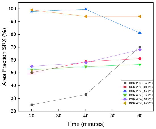 In Figure 9, the area fraction of SRX for the AXM20504 alloy after post-annealing is shown as a function of temperature and duration. The figure shows that the most complete SRX occurred for the DSR; 20% and 40% were post-annealed at the highest temperature of 450 °C, particularly at a duration of 40 min. The higher temperature shows a more complete process of relieving internal stresses developed through plastic deformation during DSR, and a higher degree of recrystallization achieved in the formation of new grains.