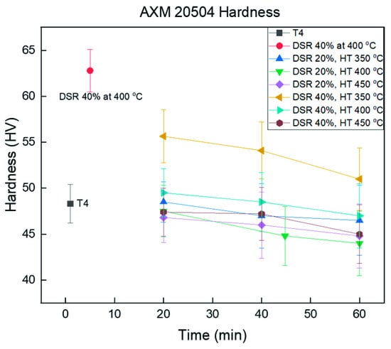 Hardness for T4, DSR 20% and 40% at 400 °C, as well as the post-annealed temperatures of 350, 400 and 450 °C for different durations of 20,40 and 60 min.