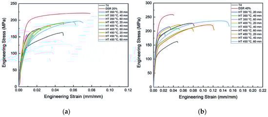 Stress–strain curves for AXM20504 (DSR 4:2 m/min), showing comparison of T4, DSR, and after post-annealing for (a) DSR 20% and (b) DSR 40%.