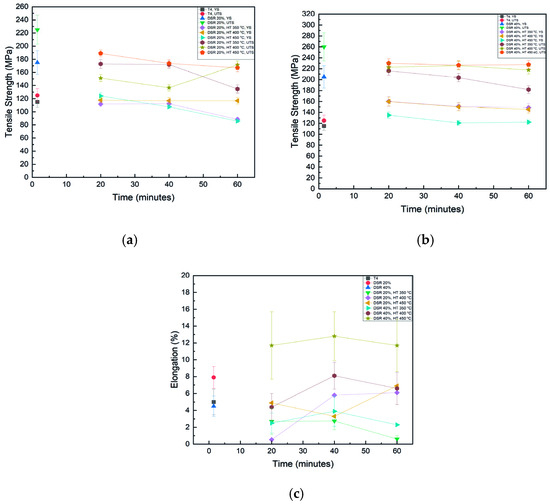 The tensile stress–strain curves for the DSR 20% at 4:2 m/min that were post-annealed samples can be seen in Figure 11a, while those for the DSR 40% post-annealed samples can be seen in Figure 11b. The maximum elongation-at-break for the post-annealed with 20% DSR reduction was approximately 7 ± 3.4% and the maximum strength was 198 ± 6.2 MPa for the material annealed at 450 °C for 60 min. However, the elongation at the break was much higher for the DSR 40% annealed at 450 °C and 40 min, reaching 12 ± 3.5%. The original as-rolled DSR 20% and 40% both had higher ultimate tensile strengths of 225.0 ± 15.2 MPa and 260.0 ± 25.8 MPa, respectively, with elongations of breaks of 7.9 ± 3.2% and 4.5 ± 1.5%, respectively. The effect of post-annealing demonstrates a significant improvement in ductility for DSR at 40%, as compared to the as-rolled specimen. While there was a drop in tensile strength for the DSR 40% with post-annealing, most of the post-annealed samples maintained a tensile strength above 200 MPa.