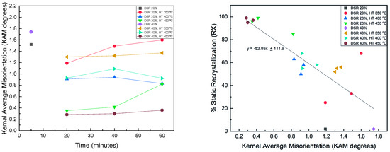 Influence of post-annealing temperature and duration on the kernel average misorientation (KAM degrees) for DSR 20% and 40% at 350, 400, and 450 °C.