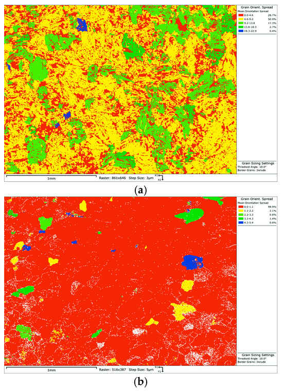 The associated GOS maps are shown in Figure 14. The EBSD data reveals that the post-annealing significantly reduced the GOS, confirming the presence of new strain-free grains throughout the microstructure with significantly lower internal misorientation and less lattice distortion.