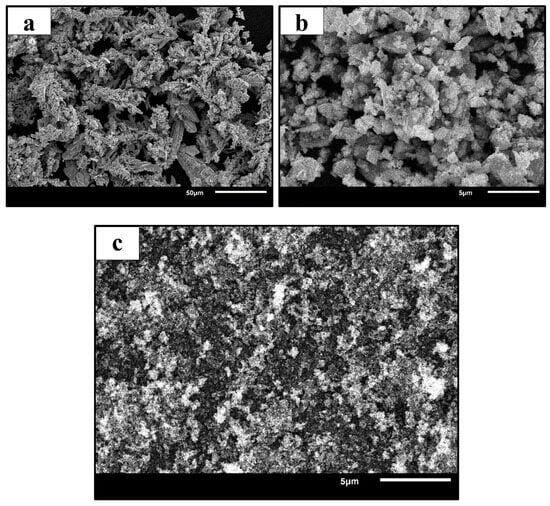 Figure 1 illustrates the SEM micrographs of the as-received Cu, TiCµ, and TiCn powders. The micrograph in Figure 1a shows that the Cu powders possess a relatively uniform size distribution with a mean particle size of ~76 μm and exhibit a typical dendritic morphology [4,5,6,7,8,9]. The TiCµ powders (Figure 1b) reveal angular and irregularly shaped particles ranging between 10 and 30 μm in size. In addition, nanoscale TiC powder was used in this study, as the incorporation of nanometric reinforcements generally refines the microstructure of sintered composites, thereby enhancing their mechanical performance [2].