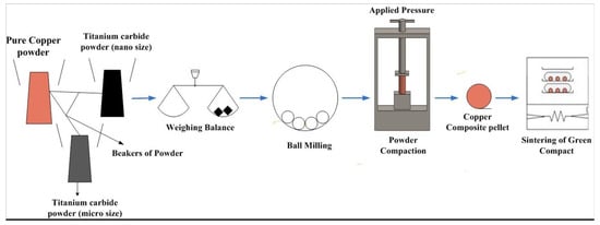 The green compacts were sintered for 2 h in a tubular electric furnace at four different temperatures (750, 800, 850, and 900 °C). Sintering was carried out under a continuous nitrogen flow of 1 L/min to protect against oxidation. After sintering, the specimens were furnace-cooled to room temperature. The overall fabrication route adopted in this investigation is schematically represented in Figure 2 [21].